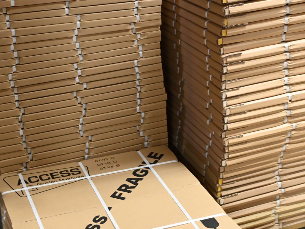 Once the greenhouse is ready to be packed, all of the large and small parts are packed together in boxes, ready for shipping. Some of the smaller greenhouses all fit into a single box, but larger greenhouses have a number of packs.