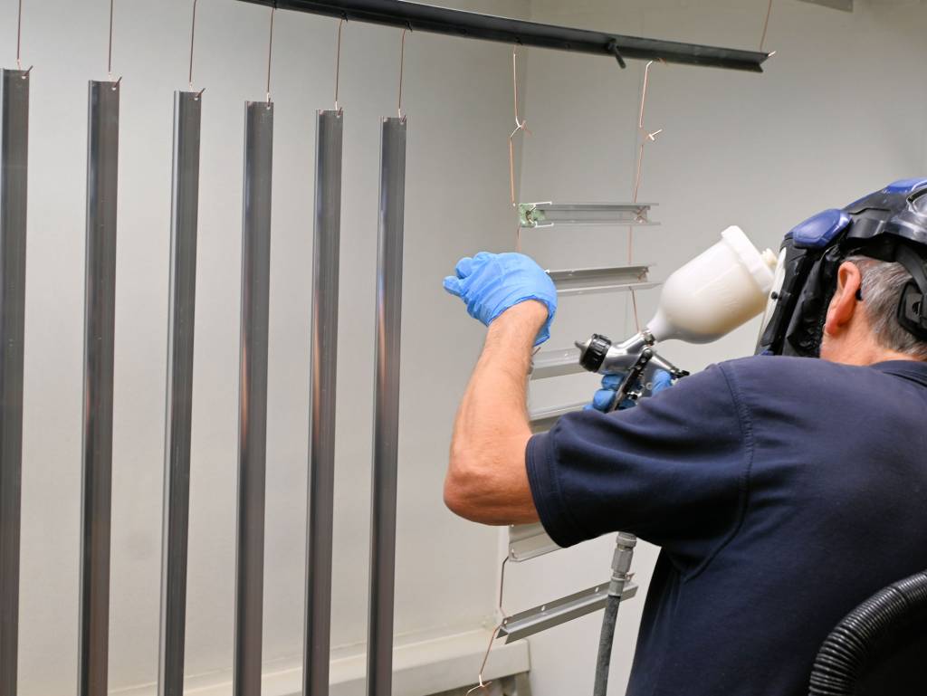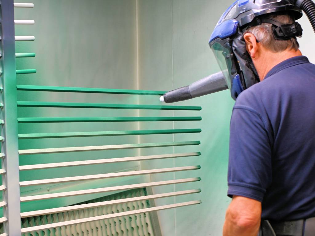 Once the etch has cured, the aluminium is coated with the polyester colour coating using a specialist powder coating gun that electrically charges the powder particles.