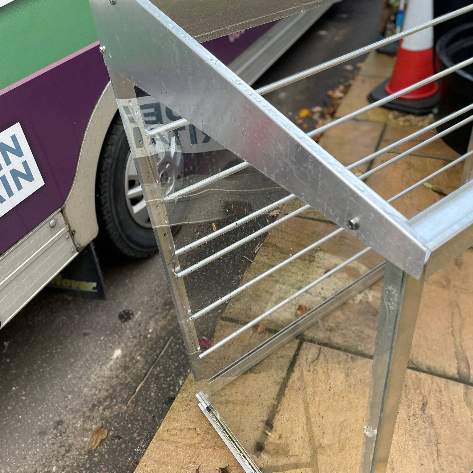 The end sheets of glass are fixed in so the smallest so will nee to fit into the vehicle as they are 65cm wide x 120cm high. There will be some scratches to the aluminium but this is architectural aluminium that will not rust or corrode.
