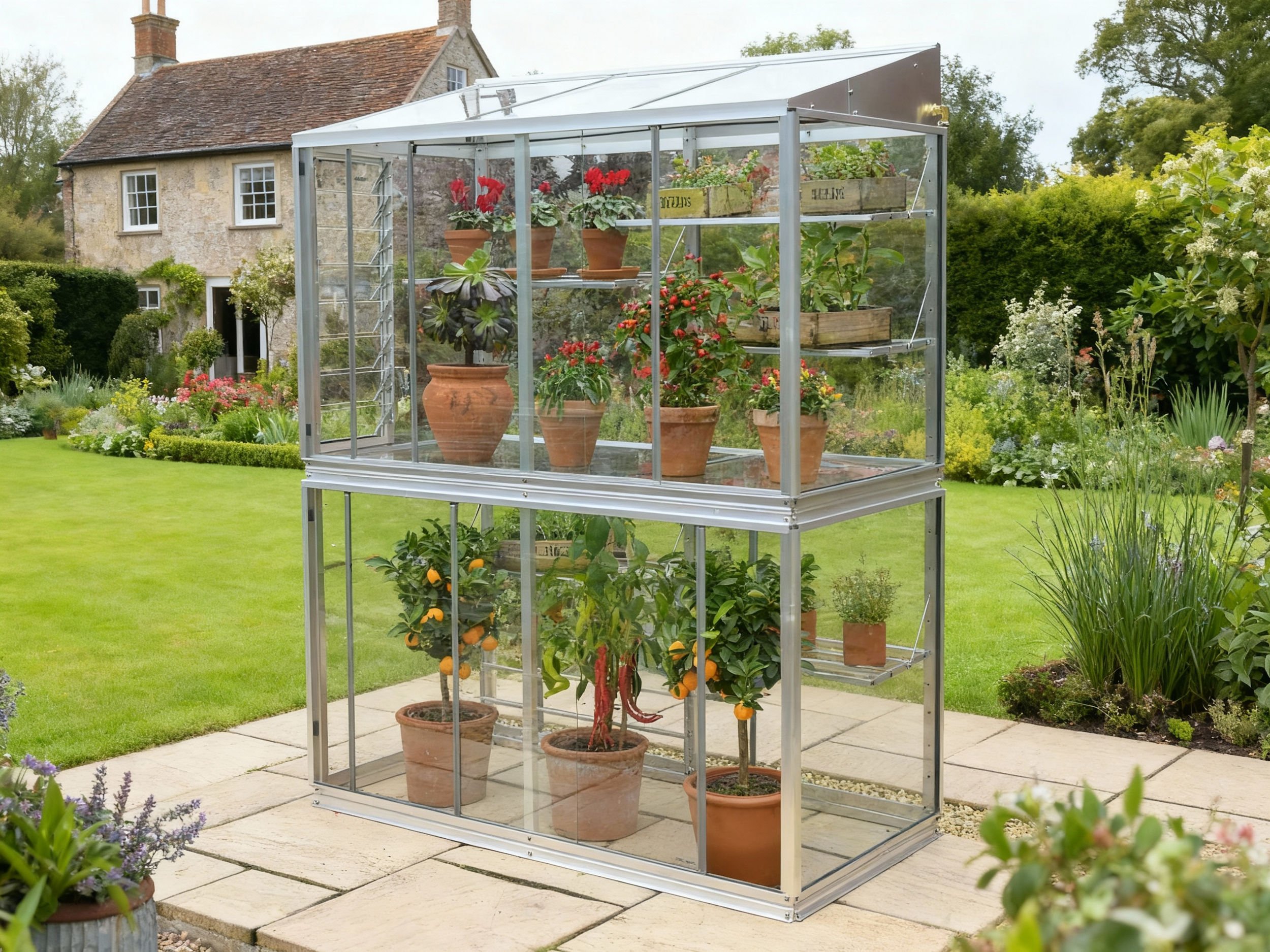 The Growhouse includes 8 deep seed tray shelves, which can be adjusted for height and can be removed or dropped flat when not required in summer. Strong but slim aluminium bars reduce shading of the plants below. The toughened glass centre staging lets light down to the lower level and is rated to 25kg per sheet. Any or all of the three staging sheets can be removed in summer for taller crops.