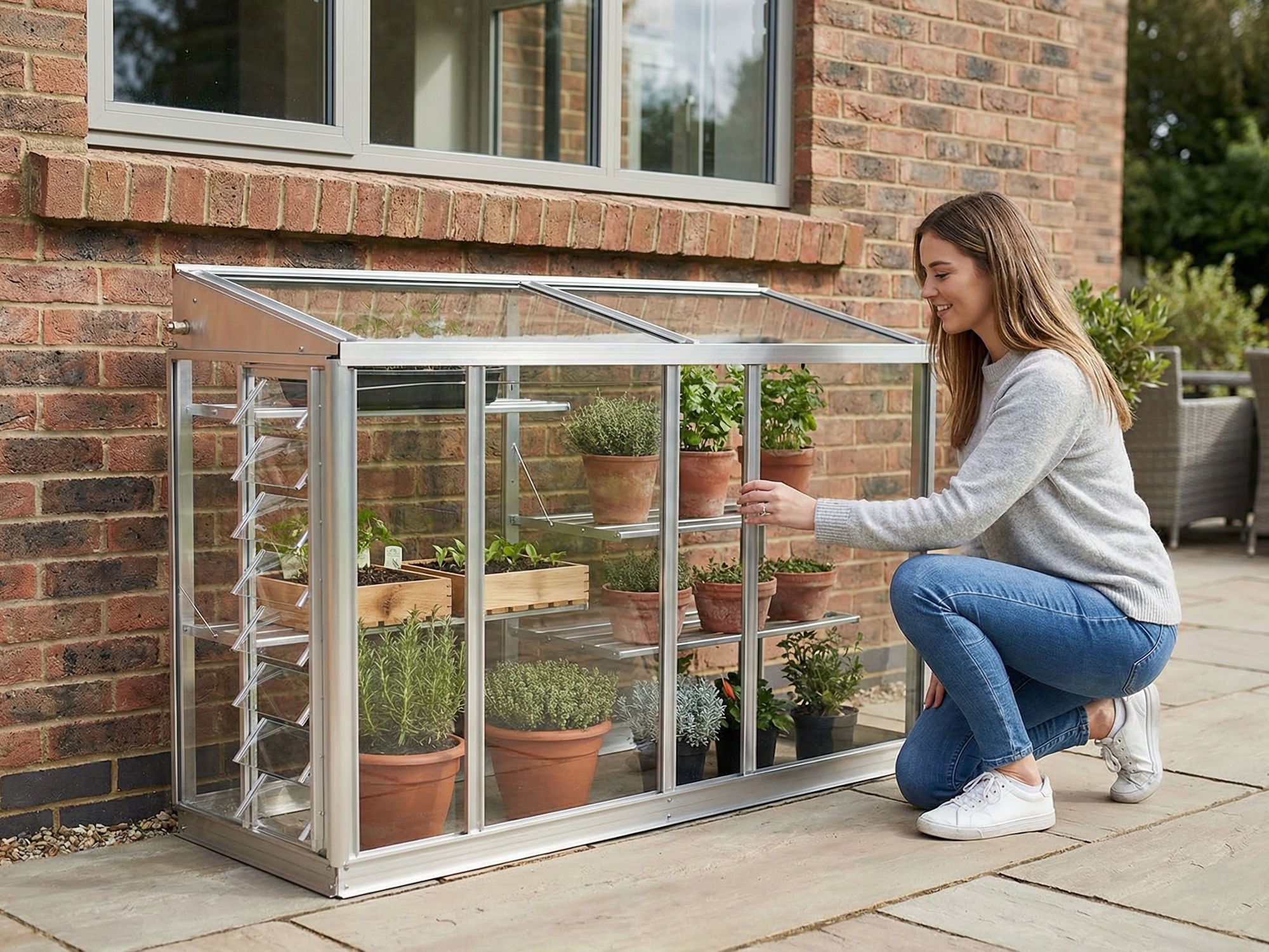 The Freestanding Harlow Growhouse includes two narrow shelves and two wide seed tray shelves, which can be adjusted for height and can be removed or dropped flat when not required in summer. Strong but slim aluminium bars reduce shading of the plants below.