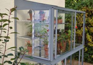 The sliding doors provide easy access into the mini greenhouse and allow infinitely variable ventilation – just an inch or so in the early spring to wide open in the summer. In addition, the roof panels slide open for superb summer ventilation. The 6′ 5″ model provides a very large opening to access plants inside the mini greenhouse.