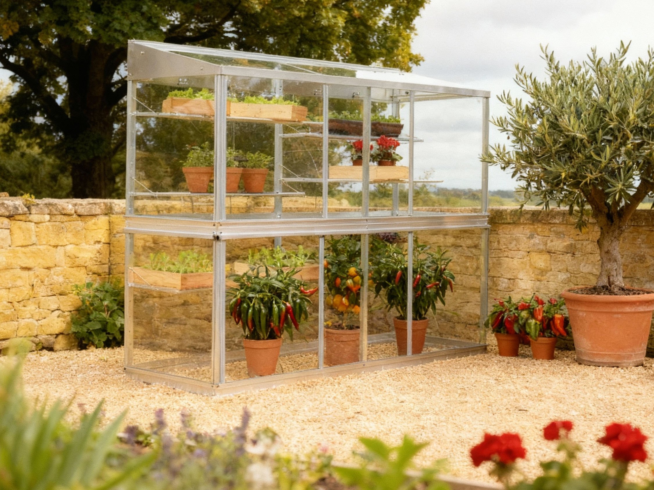 Optional extras include an automatic louvre ventwooden raised base for soil grown crops, mist wateringshading for sunny locations and shelf covers for smaller pots.
